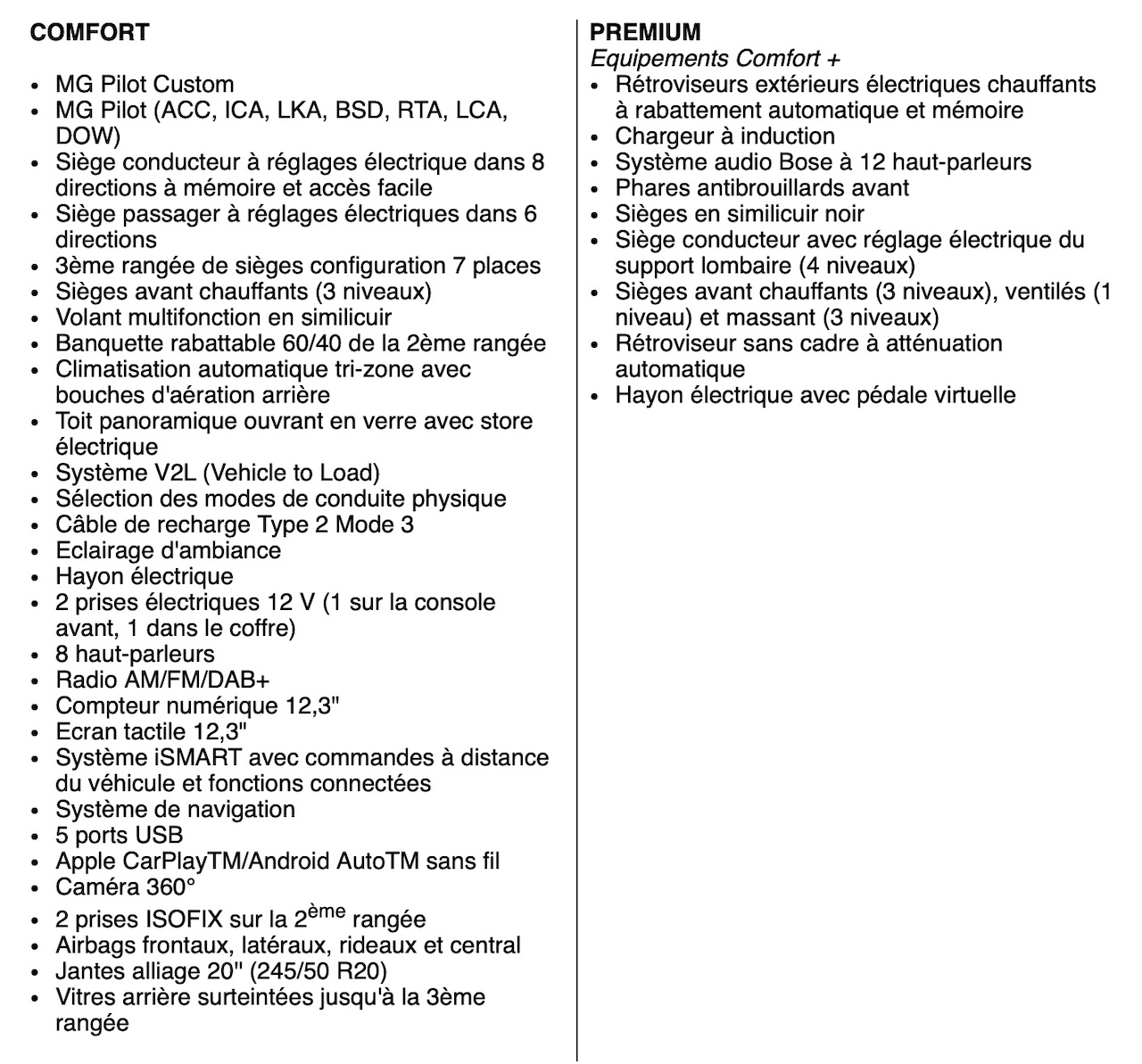 Dès la finition Comfort, le MGS9 PHEV propose une dotation très complète qui inclut notamment un double écran numérique de 12,3 pouces, le système connecté iSmart, une caméra 360°, une climatisation automatique tri-zone, un toit panoramique ouvrant, des sièges chauffants et des jantes alliage de 20 pouces. La connectivité Apple CarPlay et Android Auto sans fil est également présente dès ce premier niveau. La version Premium, proposée à partir de 41 990 €, enrichit cette base avec des équipements à forte valeur ajoutée tels que des sièges ventilés et massants, un système audio Bose, un hayon électrique mains libres et des rétroviseurs à mémoire. À motorisation identique, la distinction entre les deux finitions repose uniquement sur le niveau d’équipement, ce qui rend la gamme particulièrement lisible.