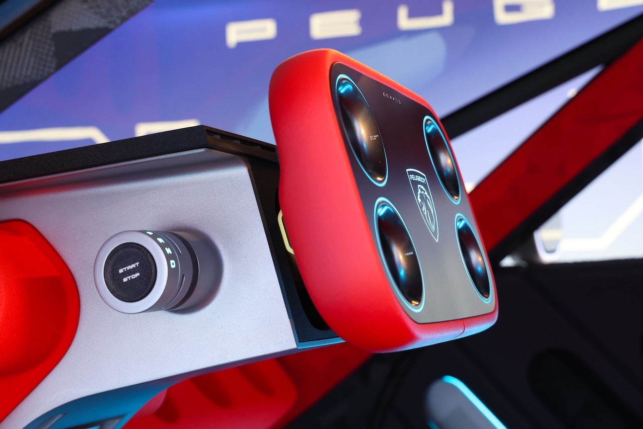 À bord, le concept va encore plus loin en réinventant l’i-Cockpit. Ici, aucun écran visible car toutes les informations sont projetées directement sur le pare-brise grâce à une technologie micro-LED. L’affichage, large et immersif, évolue selon le mode de conduite sélectionné. Le volant Hypersquare intègre également quatre zones tactiles, positionnées dans chaque coin, permettant d’accéder aux commandes essentielles sans quitter la route des yeux. L’ensemble dégage une atmosphère épurée et futuriste, pensée avant tout pour limiter les distractions et renforcer l’expérience de conduite.