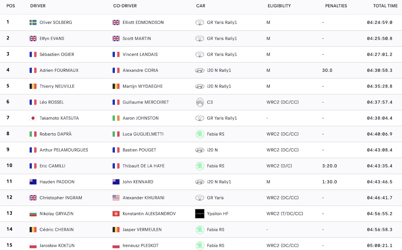 Classement top 15 général scratch rallye Monte-Carlo 2026