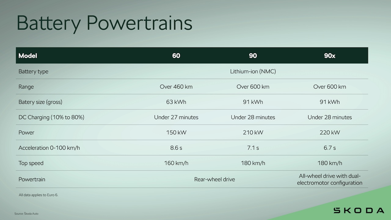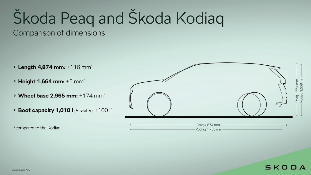 Le Peaq inaugure plusieurs innovations inédites chez Skoda avec des poignées affleurantes rétractables, un immense toit panoramique électrochromique segmenté en neuf zones, une clé digitale via smartphone ou montre connectée, une fonction Vehicle-to-Load (V2L) pour alimenter des appareils externes, et un nouveau système d’info-divertissement basé sur Android avec écran vertical de 13,6 pouces. La recharge rapide permet de passer de 10 à 80 % en 28 minutes, tandis que deux versions de puissance sont annoncées : jusqu’à 299 ch en transmission intégrale, avec un 0-100 km/h abattu en 6,7 s pour la version 90x.