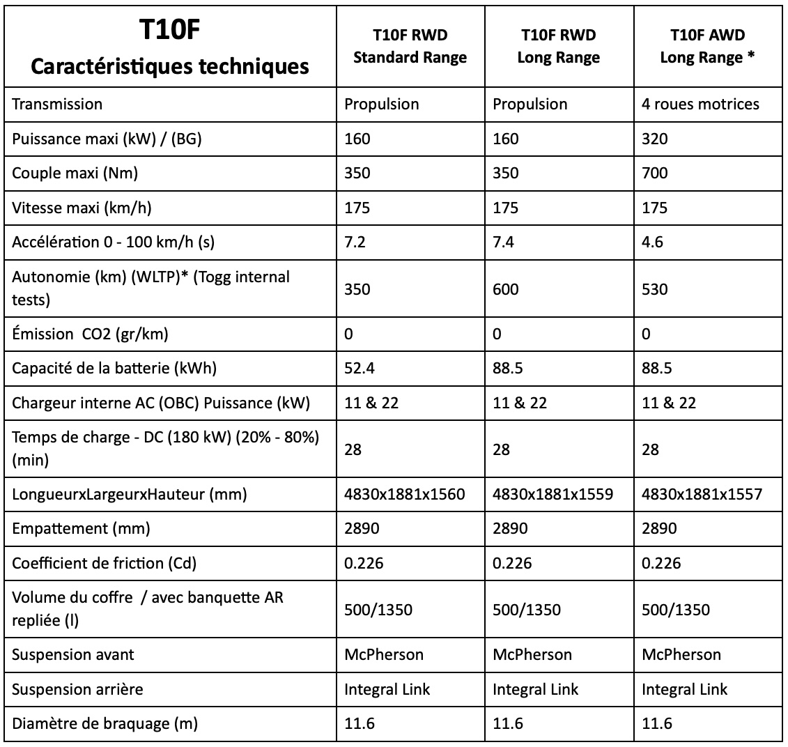 Créé en 2018 en Turquie, Togg est une jeune marque issue du monde la technologie et dont l’écosystème est basé autour de la mobilité intelligente et connectée. L’automobile est donc l’une des branches de ce nouvel acteur de la mobilité et il prévoit de vendre 1 million de voitures d’ici 2030. Après le SUV T10X, Togg présente au salon de la tech de Las Vegas, le CES, la berline TF10F dont le lancement est prévu en 2025 en Europe..