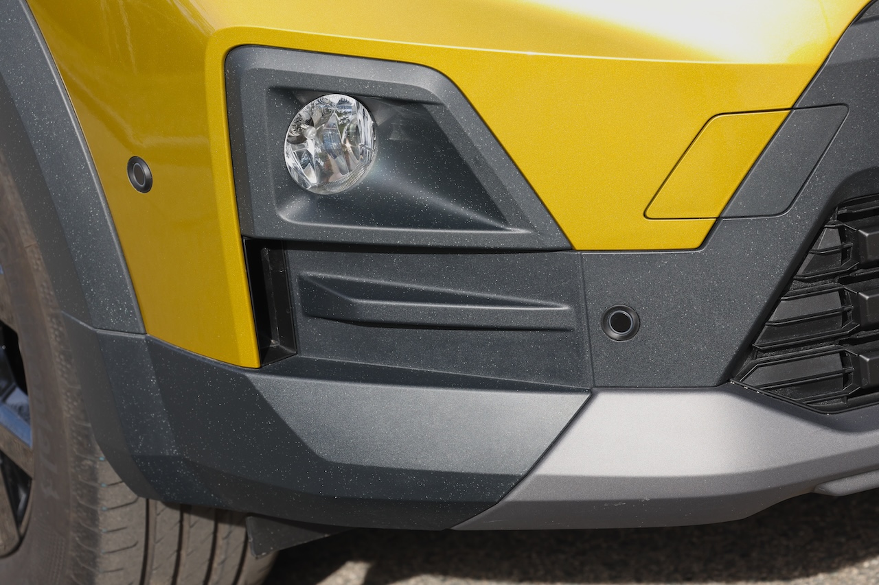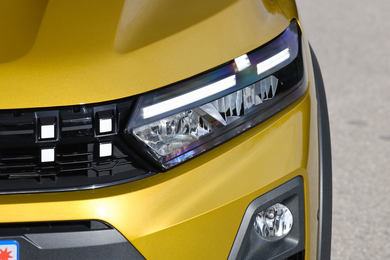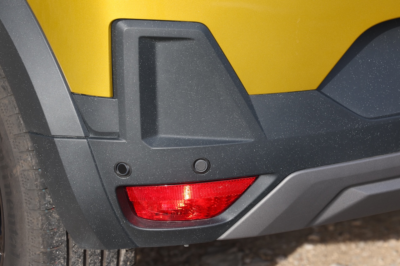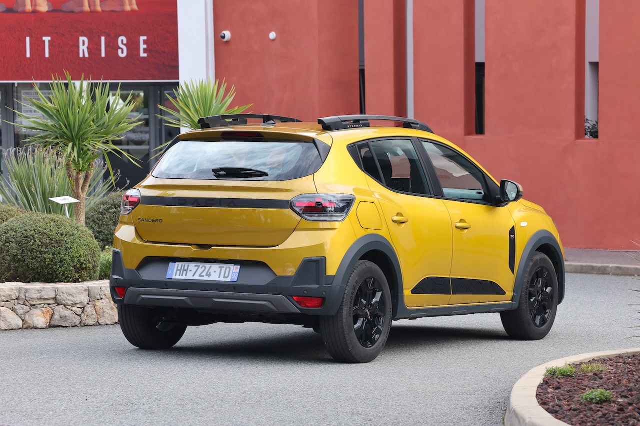 Lancée en 2020 et déjà actualisée en 2022 pour adopter la nouvelle identité visuelle de la marque, la Sandero profite aujourd’hui d’un véritable facelift. Une évolution qui concerne également la Stepway, sa déclinaison au look baroudeur. À l’avant, la signature lumineuse en « T » inversé modernise immédiatement le regard. La calandre adopte des motifs pixelisés, les boucliers sont redessinés et l’ensemble gagne en présence sans verser dans l’exubérance. À l’arrière, les nouveaux feux au dessin pixelisé, reliés visuellement par un bandeau noir, élargissent la silhouette. Le bouclier est lui aussi spécifique. Autre détail notable : l’apparition du plastique brut Starkle, déjà vu sur le duo Duster/Bigster. Composé de 20 % de plastique recyclé, ce matériau devient peu à peu un marqueur esthétique de la marque.