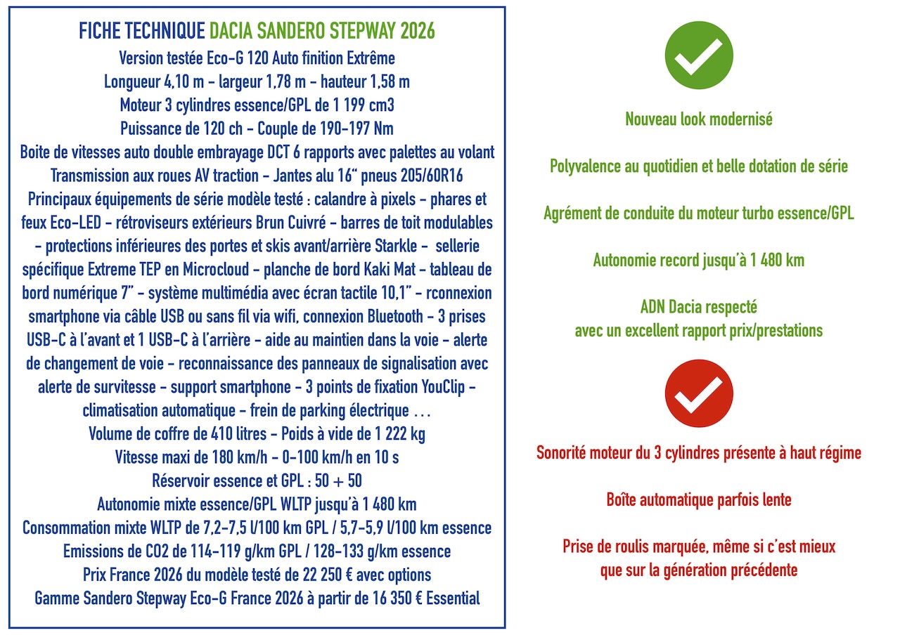 Le vrai tour de force de cette Sandero Stepway Eco-G 120 Auto millésime 2026 reste sa polyvalence. Elle ne cherche jamais à être exceptionnelle, mais elle fait tout correctement et parfois même très bien. Surtout, elle reste fidèle à la promesse Dacia, en offrir beaucoup pour un prix contenu. Malgré une motorisation plus performante, une boîte automatique et un équipement en nette hausse, la facture reste raisonnable. Une voiture simple, efficace et accessible.