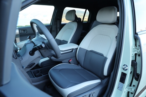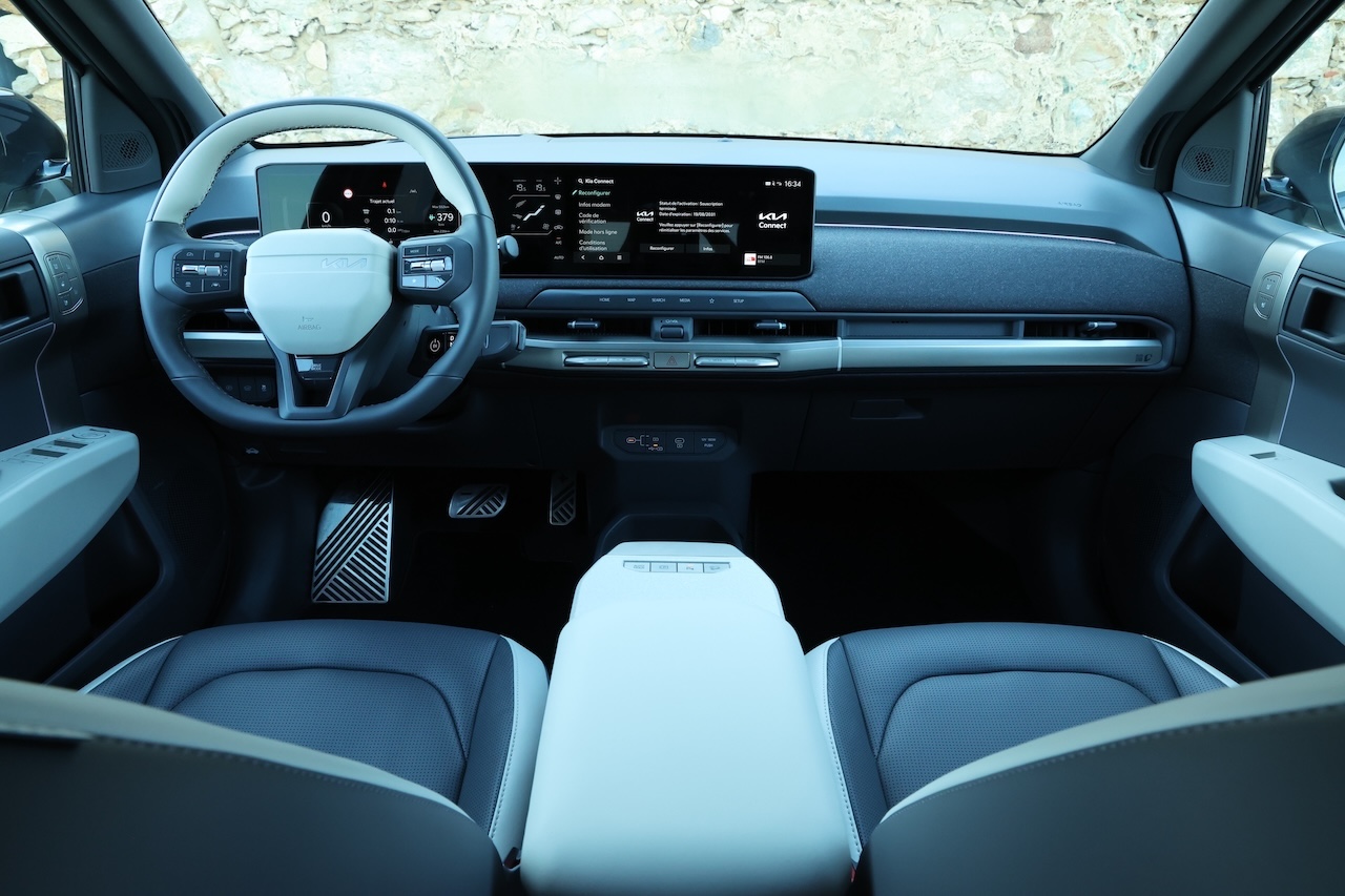 On a l’habitude de dire que les voitures électriques sont lourdes et rarement confortables, la faute aux suspensions raides comme des « bouts de bois » dont l’unique objectif est de maintenir la caisse coûte que coûte le plus à plat possible et ce au détriment du confort. Kia a donc travaillé le sujet en intégrant des amortisseurs qui agissent comme un amortisseur deux voies. En fonction des ondulations et donc de l’excitation générée par la route sur la roue, l’amortisseur utilise l’une ou l’autre des chambres en privilégiant la détente ou la compression et c’est d’une efficacité incroyable comme constaté sur les dizaines de ralentisseurs escaladés lors de cet essai à Lisbonne et ses environs et sur des routes parfois au bitume dégradé. Au volant avec une bonne position de conduite que l’on trouve en quelques réglages, l’EV3 fait oublier que l’on conduit une voiture électrique par sa facilité d’utilisation, son confort de roulement et sa sensation de légèreté. Stable, agile et bien guidé avec un train avant qui supporte plutôt bien le couple et les roues de 19 pouces sans en faire trop sur l’accélérateur bien entendu, l’EV3 est très plaisant au volant et comme la puissance est plutôt bien gérée, on déroule les kilomètres et la consommation demeure contenue avec une moyenne mixte de 16,0 kWh/100 km lors de cet essai, de quoi entrevoir de franchir dans la vraie vie la barre symbolique des 500 km, une belle promesse.