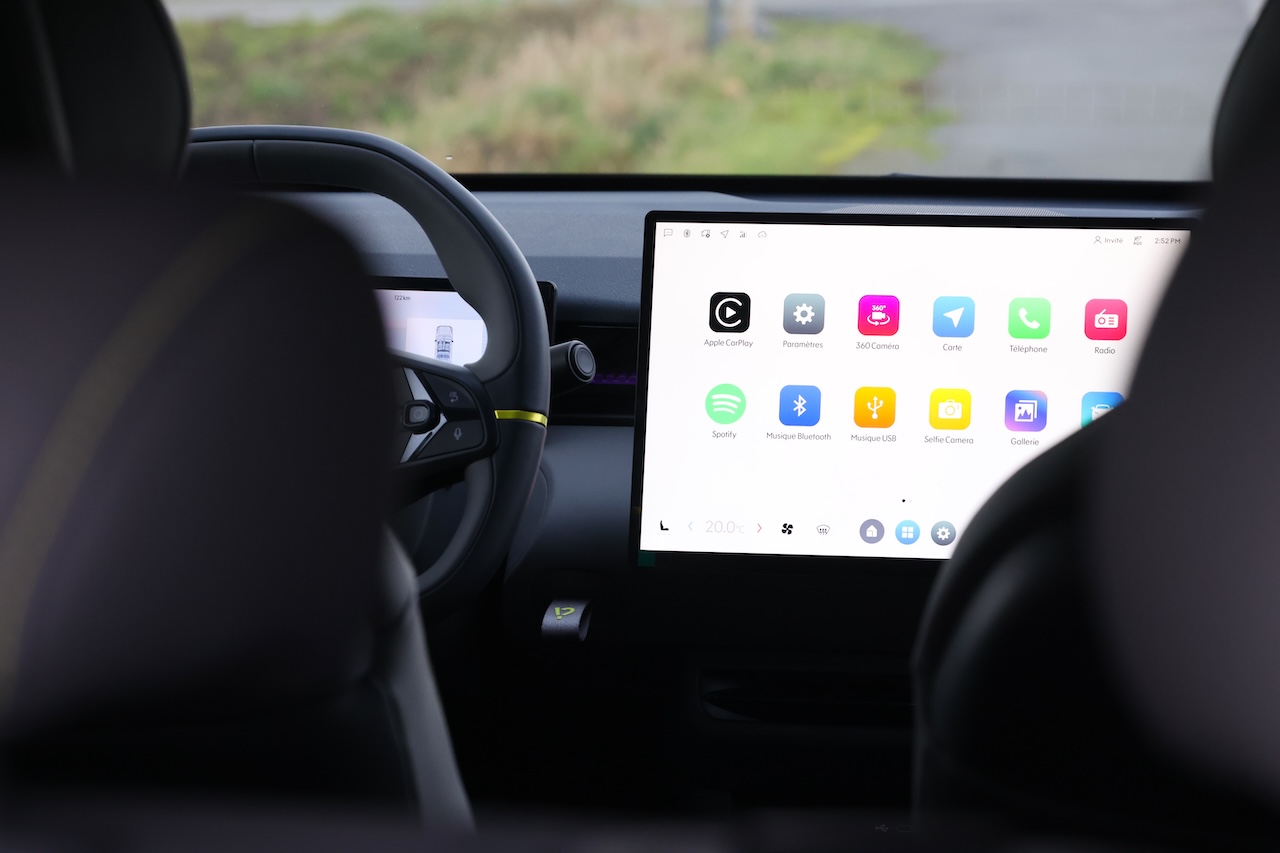 À bord, l’ambiance est épurée, presque scandinave dans l’approche. Les matériaux sont valorisants, l’assemblage sérieux, la présentation flatteuse. On évolue clairement dans un registre semi-premium. Face au conducteur, un combiné numérique de 10,4 pouces. Au centre, un grand écran de 15,4 pouces qui concentre l’essentiel des commandes. Climatisation, aides à la conduite, réglages. Tout ou presque passe par l’interface tactile et on aime ou pas. Graphiquement moderne et fluide, le système n’est pas aussi ergonomique que ça jusqu’au moment où l’on cherche une fonction précise. Désactiver certaines aides impose plusieurs manipulations. À l’usage, cela manque encore de simplicité. Une mise à jour logicielle pourrait facilement corriger le tir.