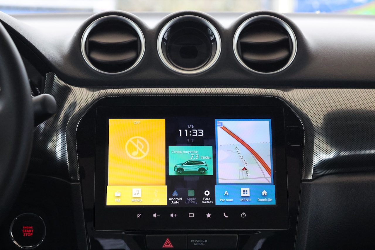 À l’intérieur, le Vitara MY26 privilégie la clarté à l’effet « wahou ». La position de conduite est naturelle, les commandes sont nombreuses mais logiques, et l’ergonomie générale se montre particulièrement appréciable lorsqu’il faut composer avec des conditions difficiles. L’écran central de 9 pouces, mieux intégré que par le passé, apporte la touche de modernité attendue. La connexion sans fil à Apple CarPlay et Android Auto fonctionne sans accroc. Le système Suzuki Connect ajoute une dimension pratique avec ses fonctions de suivi et d’alertes à distance, utiles au quotidien. La présentation reste simple, dominée par des plastiques durs, mais l’assemblage inspire confiance. Ici, pas de promesses premium car tout est pensé pour durer. L’espace à bord est suffisant pour des trajets familiaux, et le coffre offre un volume cohérent avec le segment. Rien d’exceptionnel sur le papier, mais une vraie homogénéité à l’usage.