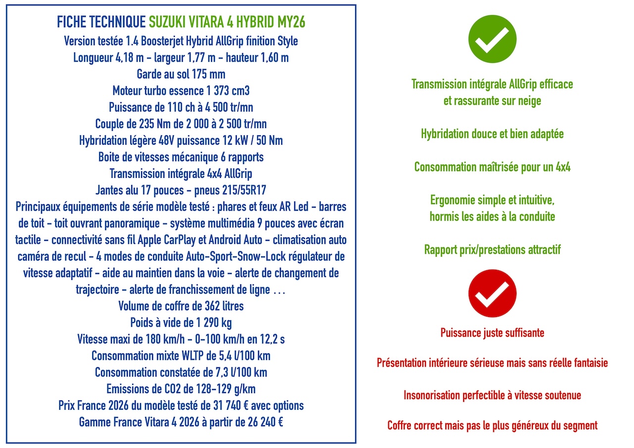 Le Suzuki Vitara Hybrid 110 ch 4×4 AllGrip MY26 ne cherche pas à suivre les tendances à tout prix. Il mise sur une conception simple, une vraie transmission intégrale et une hybridation légère efficace. Sur les routes enneigées du nord de la France, il démontre qu’il reste l’un des rares SUV compacts réellement polyvalents. Un modèle à contre-courant, pragmatique, rassurant et toujours pertinent pour ceux qui privilégient l’efficacité à la surenchère technologique.