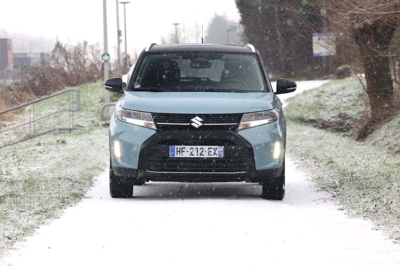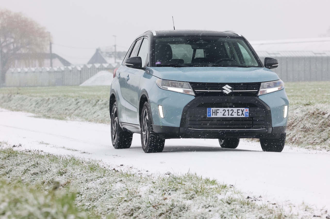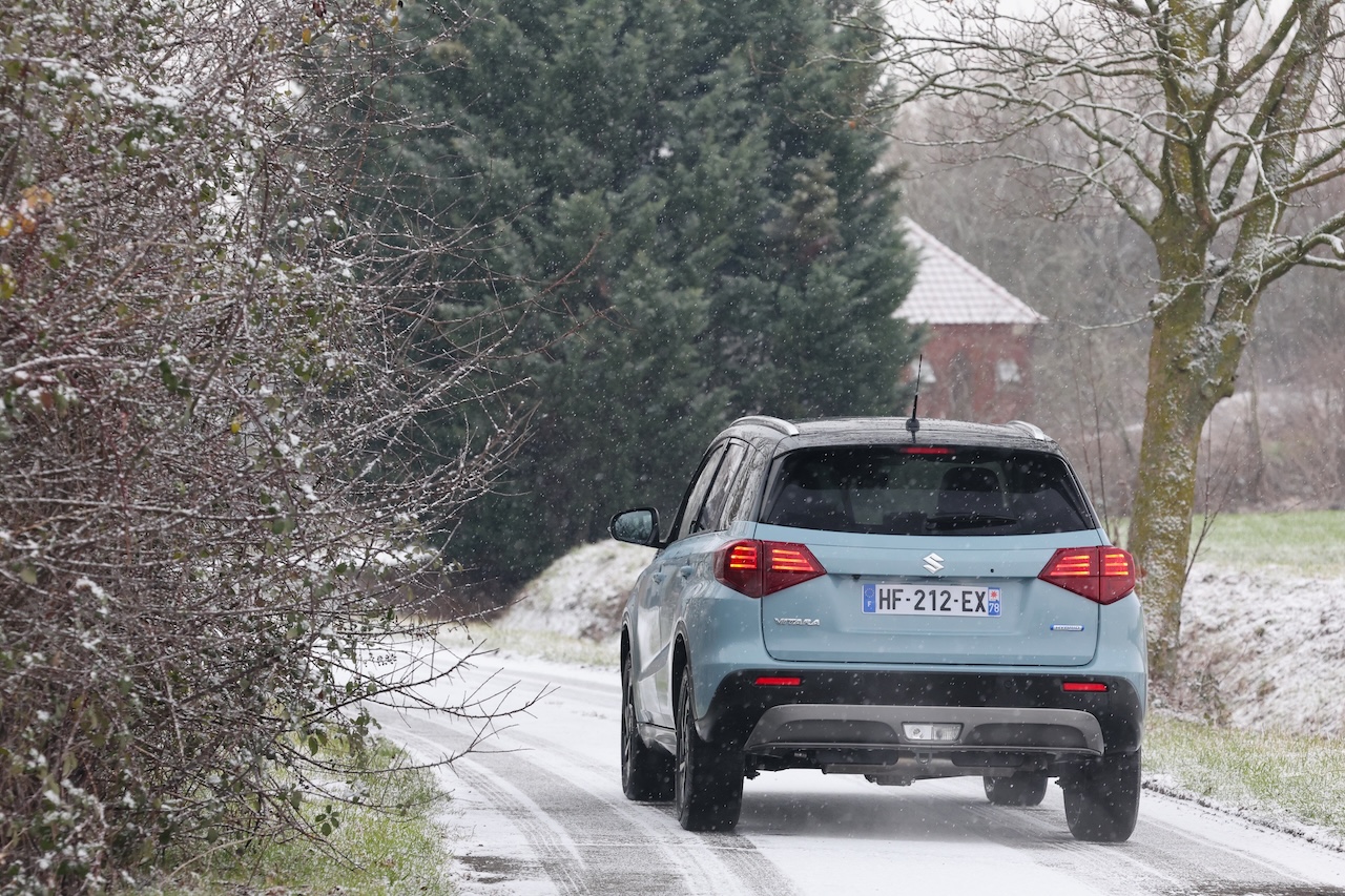 C’est sur les routes enneigées que le Vitara AllGrip révèle sa vraie valeur ajoutée. La transmission intégrale AllGrip, pilotée par une molette sur la console centrale, permet d’adapter instantanément le comportement du véhicule aux conditions de la chaussée. Sur neige tassée, le SUV conserve une motricité rassurante. Le train avant reste précis, les réactions sont progressives et prévisibles, et l’ensemble inspire confiance. Sans ambition de franchissement extrême, le Vitara offre une sérénité rare dans le segment des SUV compacts, souvent plus orientés vers le style que l’efficacité réelle.