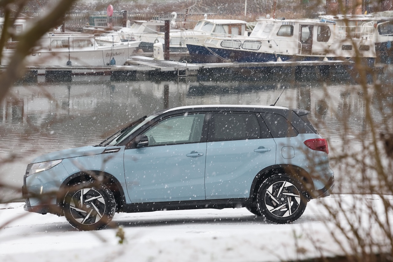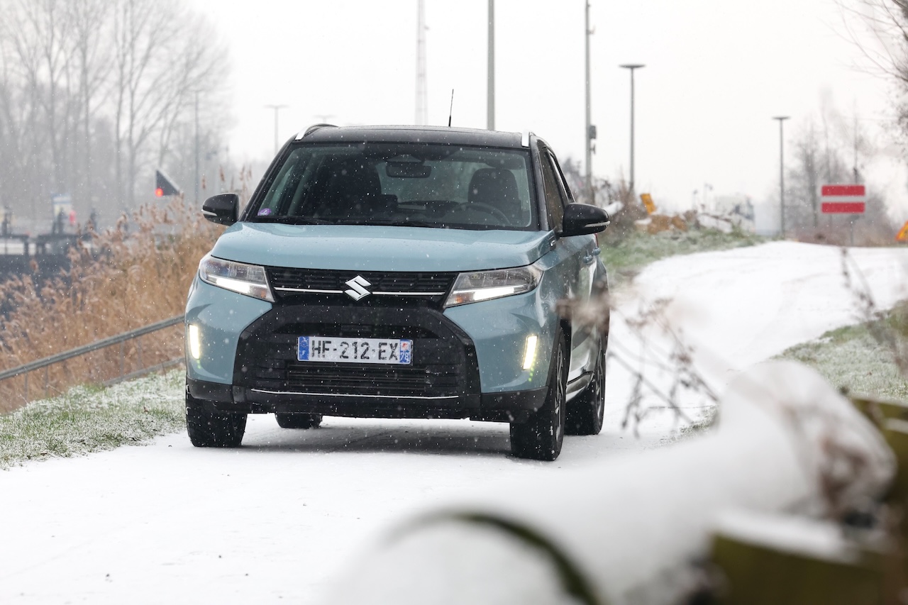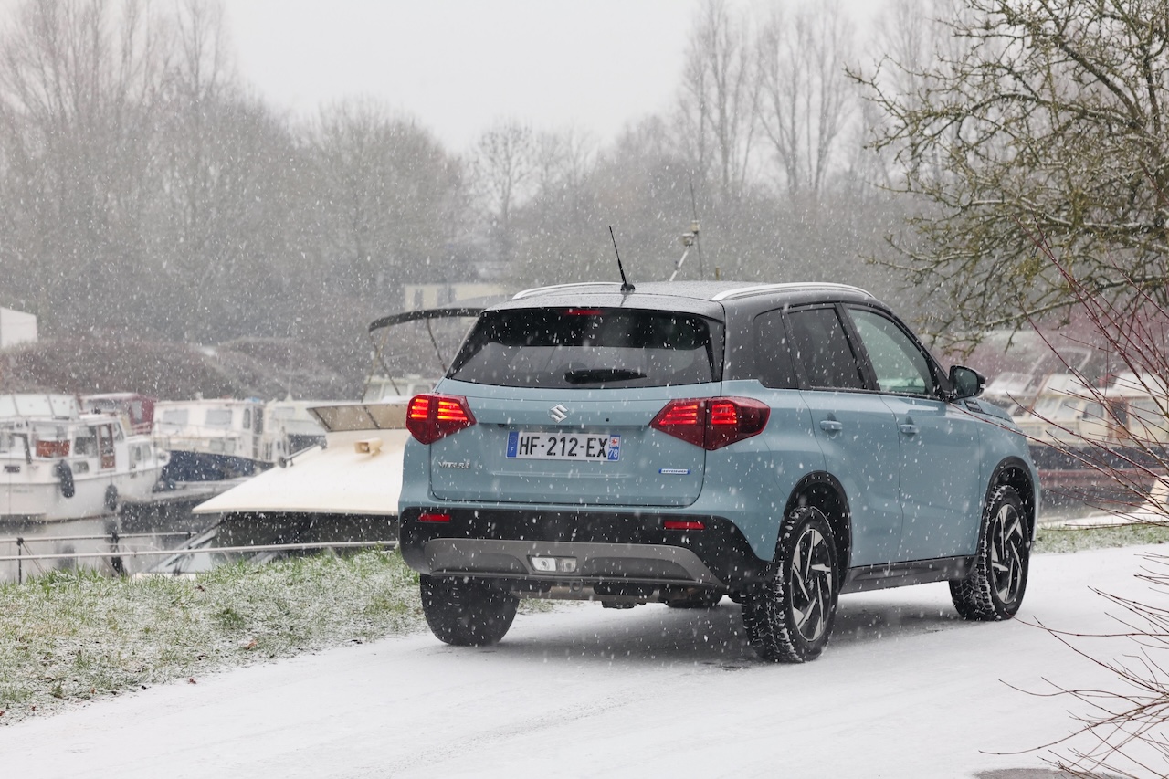C’est sur les routes enneigées que le Vitara AllGrip révèle sa vraie valeur ajoutée. La transmission intégrale AllGrip, pilotée par une molette sur la console centrale, permet d’adapter instantanément le comportement du véhicule aux conditions de la chaussée. Sur neige tassée, le SUV conserve une motricité rassurante. Le train avant reste précis, les réactions sont progressives et prévisibles, et l’ensemble inspire confiance. Sans ambition de franchissement extrême, le Vitara offre une sérénité rare dans le segment des SUV compacts, souvent plus orientés vers le style que l’efficacité réelle.