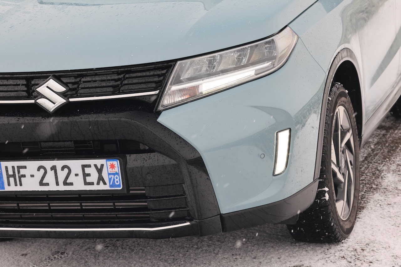 Sur les routes enneigées du Nord, le Vitara n’a pas besoin d’effets spectaculaires pour s’imposer. Son dessin reste sobre, presque intemporel, mais les ajustements apportés leur de ce quatrième facelift lui offrent un léger coup de frais. La face avant adopte un pare-chocs plus lisse, tandis que la calandre noire soulignée d’un jonc chromé conserve une certaine élégance, sans céder aux artifices à la mode. Dans cette configuration avec toit noir et vitré, le SUV japonais se détache nettement du paysage hivernal. Les jantes de 17 pouces renforcent son allure robuste, sans tomber dans l’exubérance.