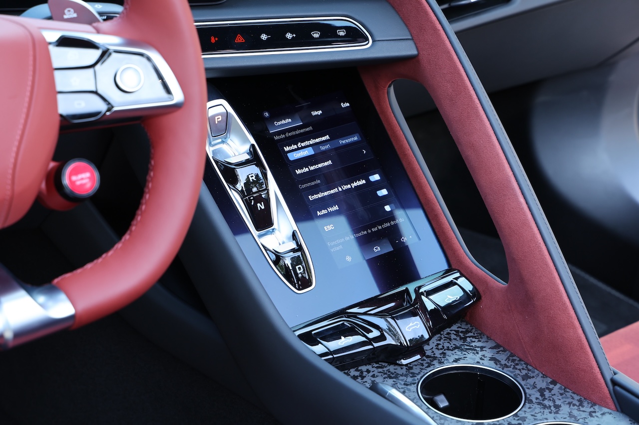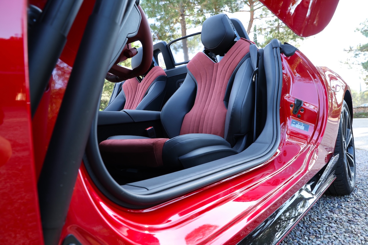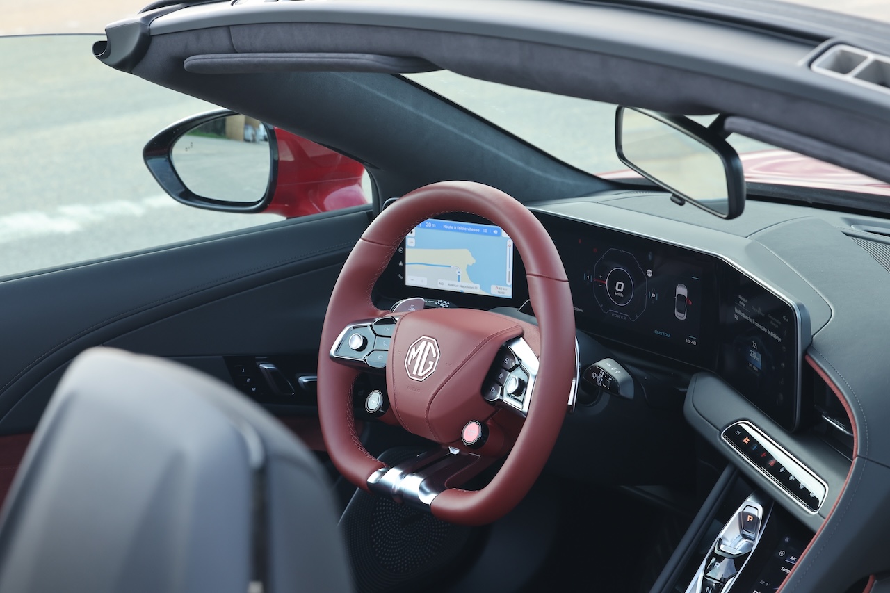 Les portes à ouverture en élytre apportent une touche de supercar et offrent un effet spectaculaire à chaque montée à bord. L’habitacle, quant à lui, surprend par son côté high-tech avec trois écrans incurvés face au conducteur, des matériaux valorisants, des sièges sport en forme de Y, similicuir et suédine. L’ensemble respire le haut de gamme. La capote triple couche s’ouvre en 10 secondes jusqu’à 50 km/h, fournie par un spécialiste qui équipe également BMW, preuve du soin apporté aux détails.
