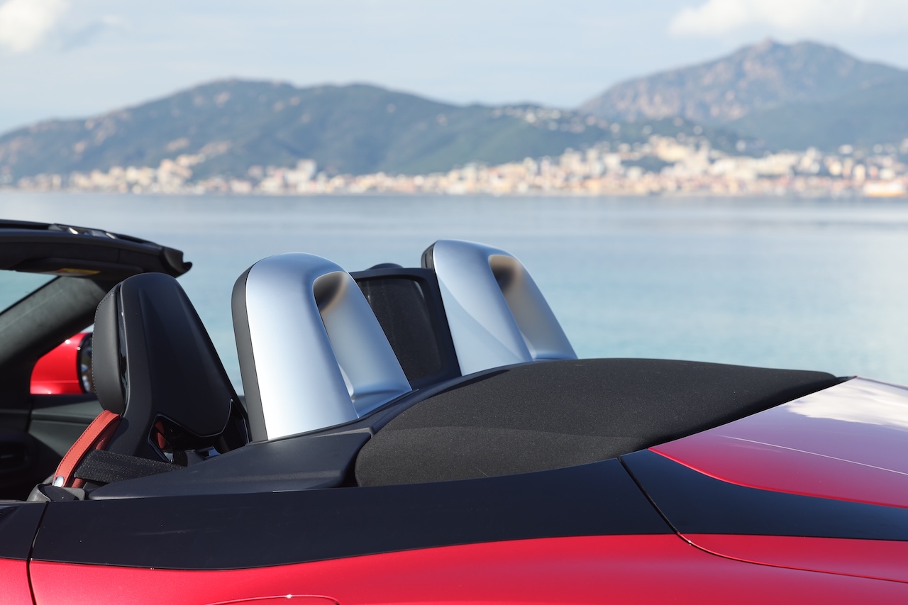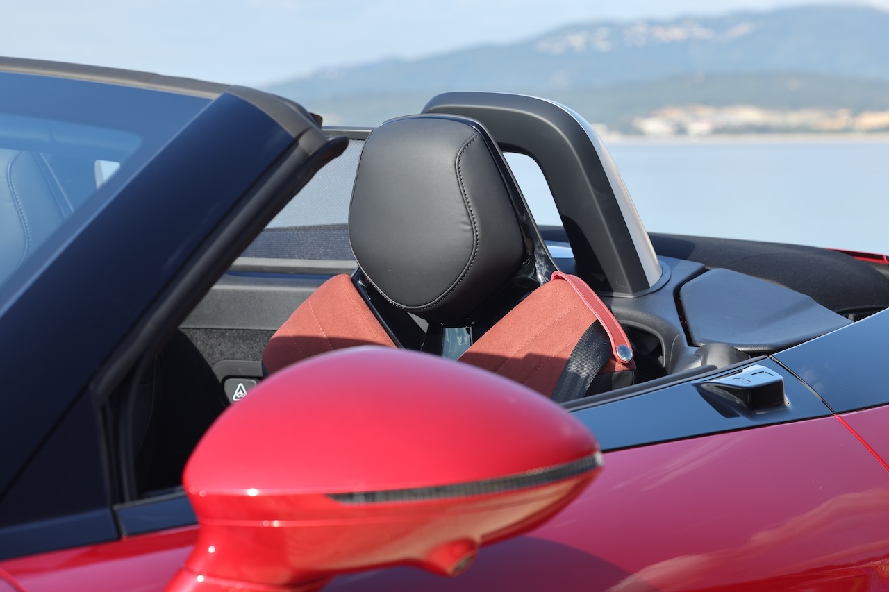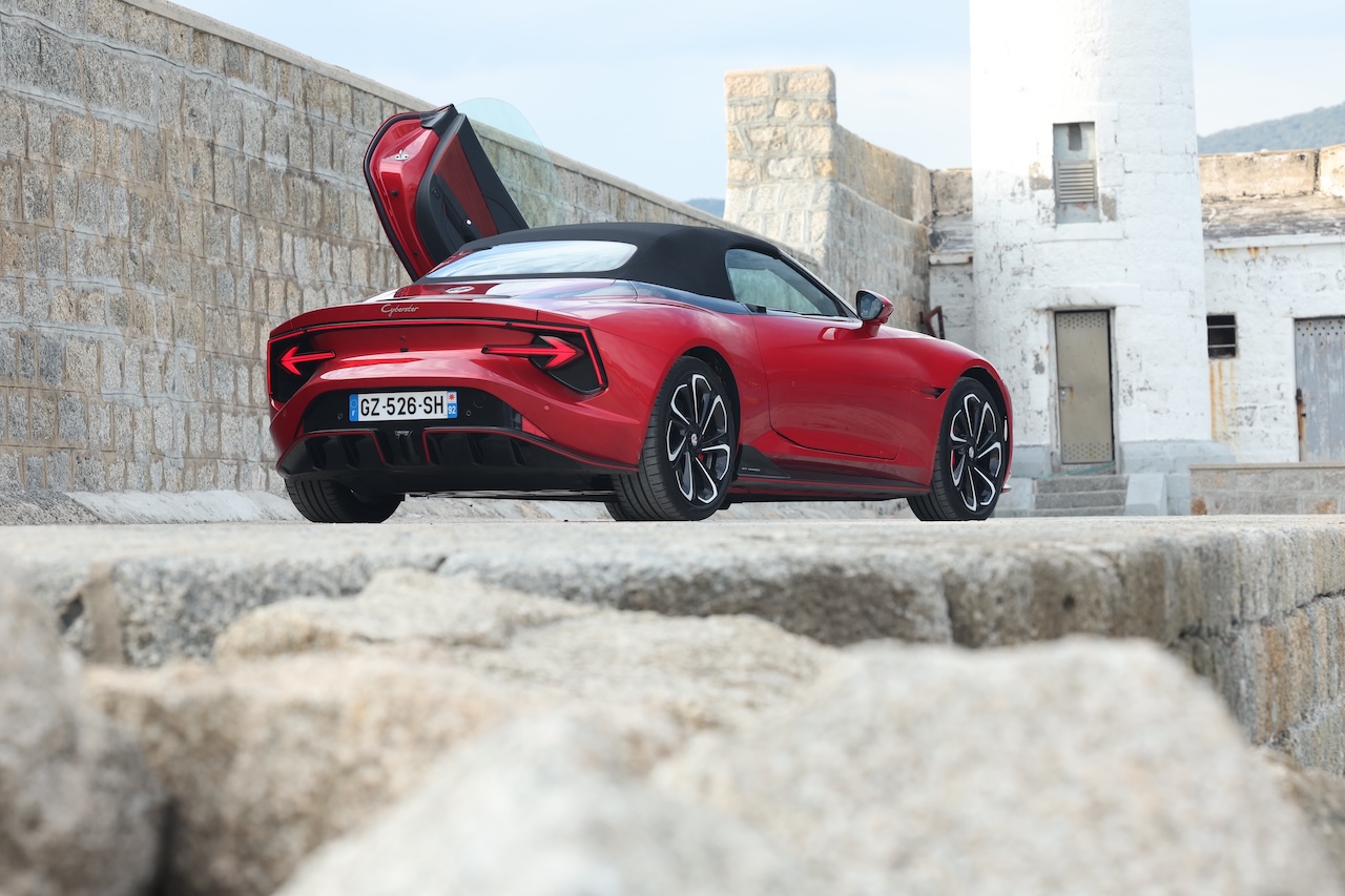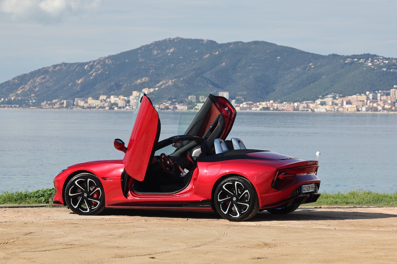 Les portes à ouverture en élytre apportent une touche de supercar et offrent un effet spectaculaire à chaque montée à bord. L’habitacle, quant à lui, surprend par son côté high-tech avec trois écrans incurvés face au conducteur, des matériaux valorisants, des sièges sport en forme de Y, similicuir et suédine. L’ensemble respire le haut de gamme. La capote triple couche s’ouvre en 10 secondes jusqu’à 50 km/h, fournie par un spécialiste qui équipe également BMW, preuve du soin apporté aux détails.