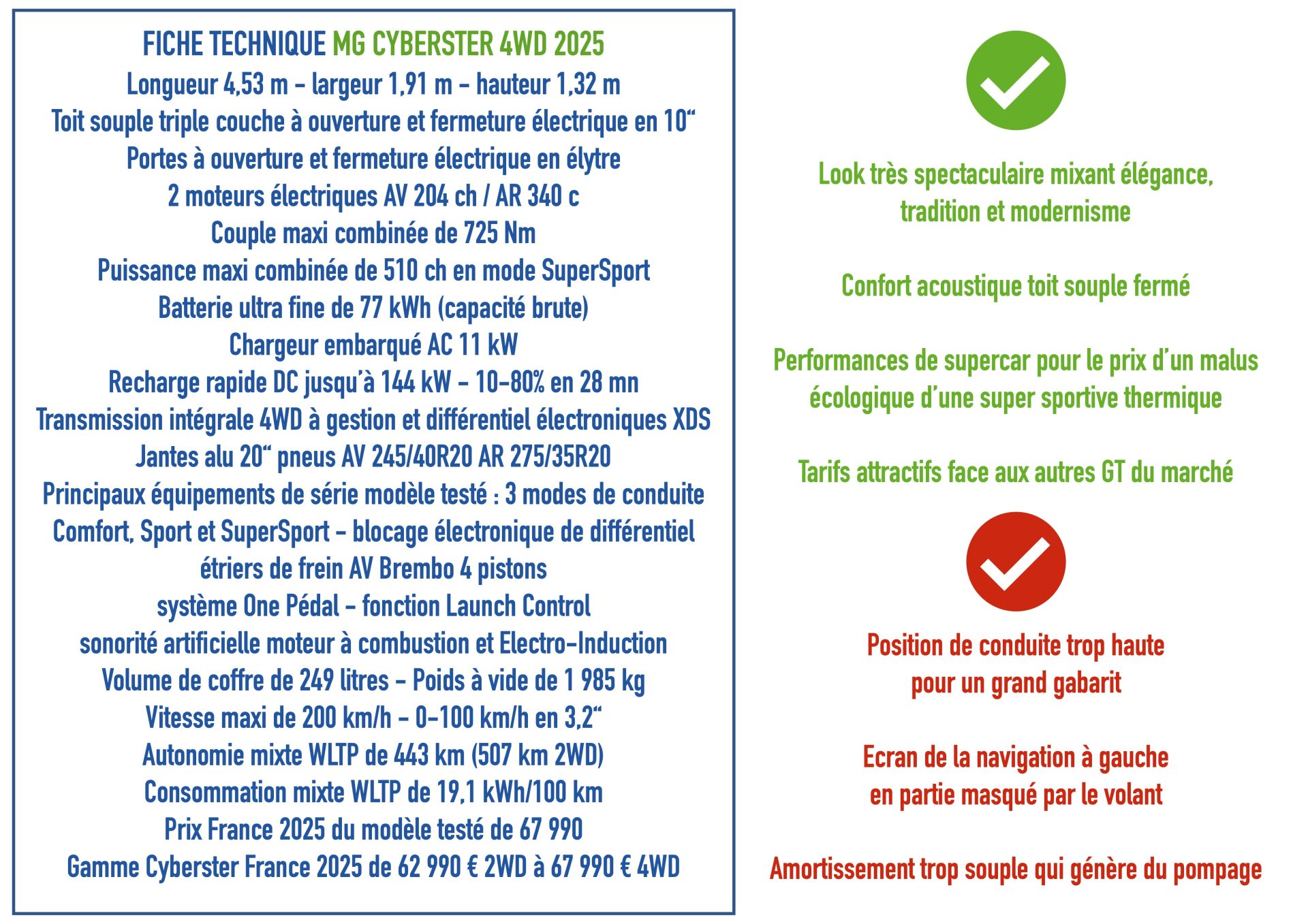 Entre style, performances et émotion de conduite, le MG Cyberster réussit son pari : celui de faire revivre le roadster anglais à l’ère électrique. Disponible en 340 ch roues arrière motrices ou 510 ch 4 roues motrices, il s’impose comme une véritable alternative aux roadsters thermiques premium. MG prouve qu’elle n’a rien perdu de son âme et simplement qu’elle a troqué le rugissement du moteur pour le silence électrisant du futur.