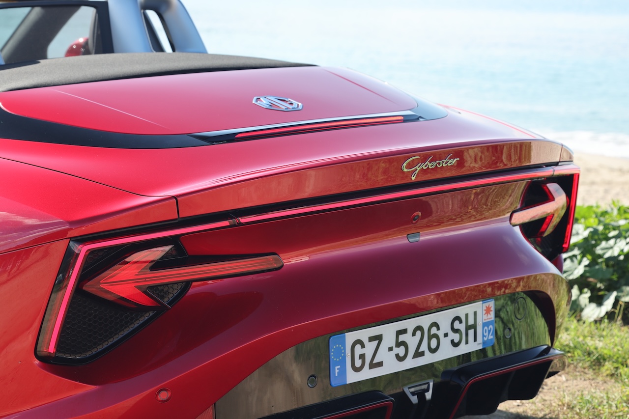 Dévoilé en 2021 sous forme de concept puis présenté en série en 2023, le Cyberster est arrivé sur nos routes en 2025. Inspiré des lignes de la mythique MG B (produite à plus de 500 000 exemplaires dans les années 60-70), il marie élégance classique et modernité affirmée. L’avant reprend la fameuse calandre en ailes, clin d’œil aux anciennes MG, tandis que l’arrière plus futuriste arbore des feux en forme de flèche évoquant l’Union Jack. Le tout est surmonté d’un becquet façon « bec de canard » type Kammback, optimisant l’aérodynamisme à la manière des légendaires Ferrari 250 GTO ou Aston Martin DB6 Vantage. De belles références.