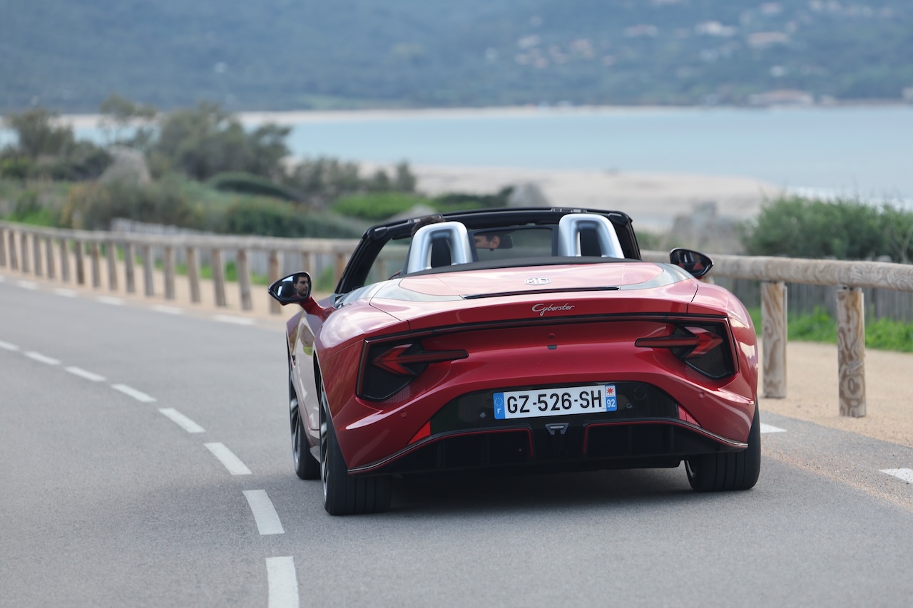 Sous sa ligne sculptée, le Cyberster cache une motorisation 100 % électrique déclinée en deux versions propulsion de 340 ch et transmission intégrale de 510 ch. Notre modèle d’essai, la version bi-moteur 4WD, impressionne par sa vigueur. En mode Supersport, les 510 ch se déchaînent sans retenue, façon on/off, pour des sensations dignes d’un track day. Mais sur route, le mode Comfort s’impose naturellement, offrant une gestion de la puissance bien plus douce et progressive. Malgré près de deux tonnes sur la balance, le Cyberster étonne par son équilibre et son agilité. Son empattement long et sa répartition des masses parfaite (50/50) lui confèrent une belle homogénéité. Le train avant, précis et communicatif, et le train arrière guidé par un essieu multibras assurent une efficacité redoutable. Pas de mauvaises surprises non plus car grâce au blocage électronique XDS, le Cyberster reste sain, même en cas d’optimisme, mais pas trop non plus. Les relances sont fulgurantes, le couple instantané catapulte la voiture à chaque accélération, mais toujours dans un esprit GT avec un amortissement un peu souple lié à son poids.