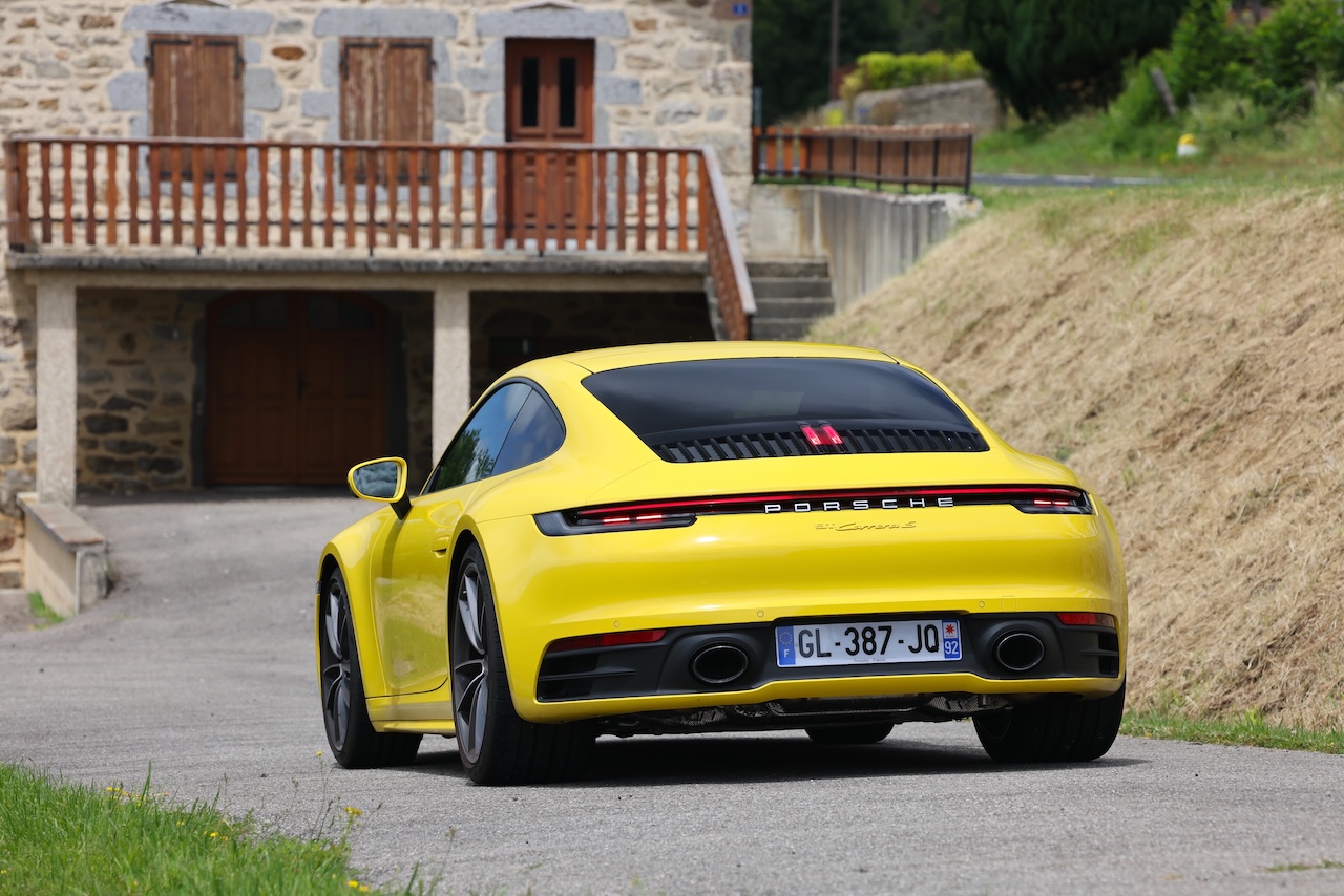 Une Porsche 911 n’est pas qu’une voiture de sport et la Carrera S type 992 le démontre au volant avec une polyvalence déconcertante. Avec les 450 ch de son flat 6 biturbo, elle offre tout ce que l’on peut attendre d’un véritable moteur thermique turbocompressé sur un coupé sportif. Puissance et couple sur une large plage du régime et une boite auto PDK juste exceptionnelle avec des verrouillages comme on aime et la puissance qui passe sur la route par les roues arrière, comme au bon vieux temps, mais avec un arsenal d’aides à la conduite qui permet ainsi de conduire en toute sécurité. Si par bonheur on y ajoute les roues arrière directrices (en option) comme sur notre Yellow Racing d’essai, alors la 911 Carrera S type 992 est juste extraordinaire et elle le rend encore mieux avec sa musicalité dont on ne se lasse pas, façon tube de l’été, avec son échappement sport en option et donc indispensable. Hyper confortable et performante, la Carrera S est à son aise sur toutes les routes, dans l’étroit, le sinueux et le rapide et lorsque l’on repasse en mode « cadre supérieur » elle redevient docile et passe-partout. Bluffante d’efficacité, la 911 Carrera S type 992 est le compromis parfait entre sportivité et confort, la 911 ultra polyvalente. Son moteur d’une souplesse royale, son châssis affûté et ses modes de conduite qui permettent d’adapter parfaitement sa conduite à son envie du moment, ne sont que du bonheur.