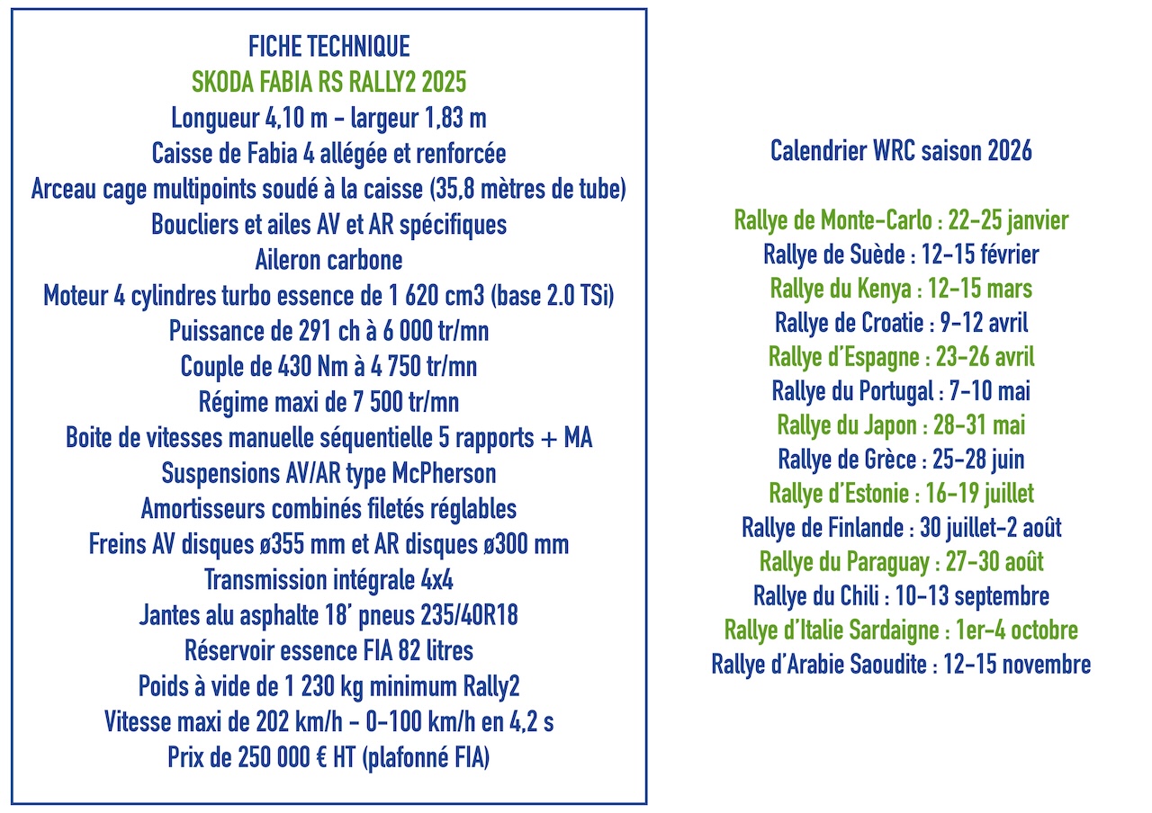 Pour rester la reine de la catégorie, la marque tchèque a sorti en 2023 la Fabia RS Rally2 construite sur la base de la dernière Fabia 4. Face au bolide tchèque développé par Skoda Motorsport, des Citroën C3, des Hyundai i20, des Ford Fiesta et la nouvelle Toyota Yaris, sacrée dès sa première saison complète en mondial WRC2 avec Oliver Solberg en 2025. Avec l’arrivée dès le Monte-Carlo 2026 (22-25 janvier) de la Lancia Ypsilon HF Rally2, la Fabia va devoir encore élever son niveau de jeu en puisant les ultimes réglages dans son homologation actuelle.